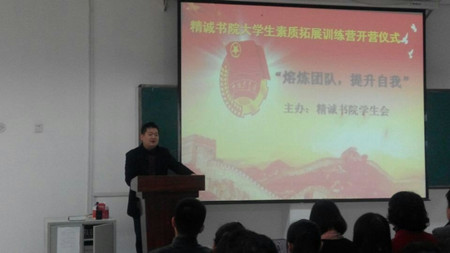 11月9日,新乡校区问学楼302室精诚书院大学生素质拓展训练营精彩开营,学生事务发展部副主任张东老师、通识中心的专业教师杨红娟和张海强老师以及精诚书院的副院长张新老师,赵元雪老师应邀参加了开营仪式。会上张东老师应邀致辞,表达了对我院成立大学生素质拓展训练营的赞誉和厚望,随后张新老师和学生代表也分别做了精彩发言,此次开营仪式鼓舞了士气,凝聚了人心。