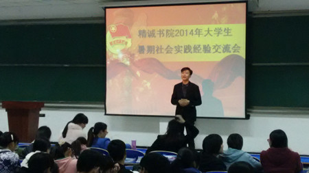 为给同学们提供一个交流暑期社会实践经验的平台,开创我院社会实践活动新局面,2014年11月12日晚18:00,精诚书院在新乡校区问学楼102隆重举办了以“实践来祝我,分享为进步”为主题的经验交流会。精诚书院辅导员李高杰、韩笑妍、李彤老师与200余名2014级新生一同参与了本次经验交流会。