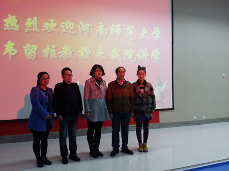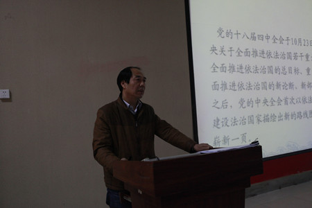 2014年11月13日下午,我院牧野大讲坛暨精诚讲坛之“解读十八届四中全会专题报告--做法制建设的积极参与者”讲座在新乡校区问学楼T教室隆重举行。本次讲坛由河南师范大学法学院副院长韦留柱教授主讲,我院副院长赵元雪主持,全体辅导员及200余名党员、预备党员、积极分子聆听了此次讲座。