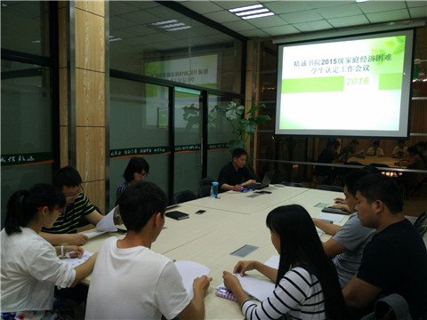 为做好我院2015级家庭经济困难学生认定工作,切实保证国家制定的各项高等学校资助政策和措施真正落实到家庭经济困难学生身上,针对贫困生认定工作,精诚书院在学生会办公室开展了2015级家庭经济困难学生家庭经济困难学生认定工作会议。