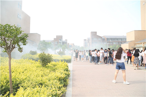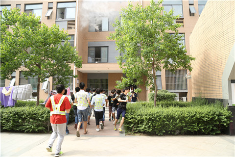 演习开始时由学院党委书记王志凯下达演习开始的命令,随着警报的响起,书院辅导员立即到达宿舍楼中,指导学生有序快速疏散,学生根据应急预案中规定的路线,弯着腰、猫着步,用手帕、毛巾等捂住口鼻,沿着宿舍楼梯快速下楼,有序撤离到指定的安全地带,随即各班辅导员清点人数,经过清点发现有一名学生被困火场,指挥部下达前往救援的命令,随后书院老师协同安保中心的工作人员上楼救助被困学生,经过搜救安全的将被困学生救出,演练共用时15分钟,300多名师生全部安全疏散。本次消防演习整个过程紧张有序、实用性强,收到了预期效果。
