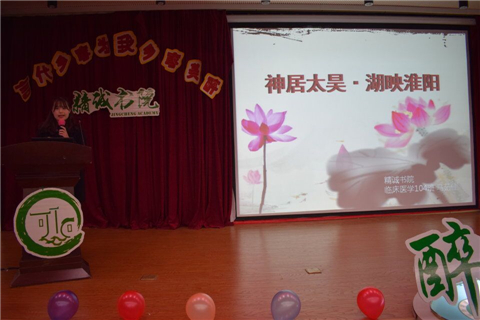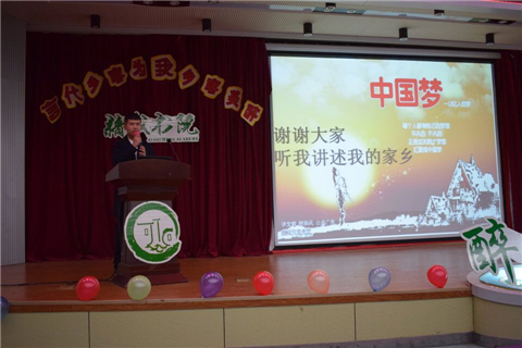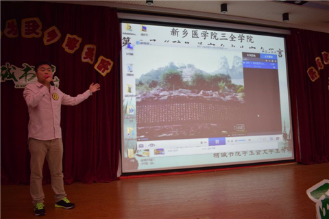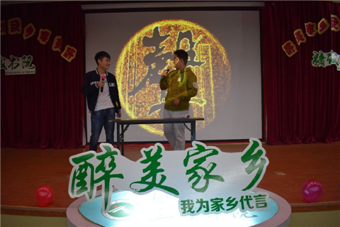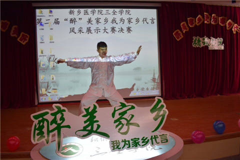各位参赛者用短短几分钟的PPT把家乡的魅力展现的淋漓尽致,悠久的历史文化、心旷神怡的美景、秀色可餐的地方特色小吃,无不表达出家乡之美,家乡之“醉”。撩起观众低头闻嗅花之芬香、伸手拂云山之巍峨、偷拭三尺垂涎之口角以身临其境之感,让观众为之送出阵阵掌声与欢呼声。1号选手曹通用精彩的演讲向同学们展示着天津这座文化古城,浓厚的文化气息,迷人的夜景,各时期各样式的建筑群,犹如把世界都收纳在天津这座城市,同学们也为之动容。来自武术之乡登封的6号选手郑东飞,一身正气,精气神十足,震撼登场。他豪壮的说辞,激情的演说,把大赛一次次推向高潮。现场的互动环节,主持人以古诗中地方景点为谜底,让现场观众抢答。“飞流直下三千尺,疑是银河落九天”“月落乌啼霜满天,江枫渔火对愁眠”一句句耳熟能详、精美绝伦的诗句,激起观众间一阵阵波浪,大家积极参与,踊跃发言,使赛场再次升温。最后的才艺表演环节把比赛推向高潮,3号马佳茹的“扇子舞”以优美的舞姿,迷倒众人,4号程英奇的工笔国画,把国画之魅力,艺术之博大展现给众人,惊艳的国画让观众无不为之称赞。5号选手的太极更是演绎了中国功夫。“一说一颂”、“一舞一武”、“一书一画”,滑稽的说逗、深情的朗诵、优美的舞姿、轻灵的太极、刚劲的笔锋、秀美的国画让在坐师生为之拍案叫绝。