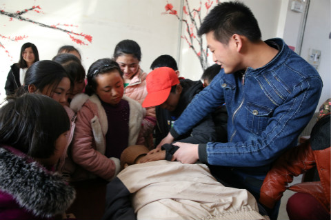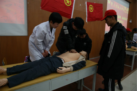 在“医学常识我来教”环节,我院志愿者赵曜带着Tom and Jerry来到现场给大家上了一堂妙趣横生的《身边的医学小知识》。一段5分钟的视频竟“隐藏”了感冒和麻疹的小知识,赵曜同学幽默风趣的讲解,使小朋友们对简单的医学常识有了深刻的了解。随后,志愿者介曼、杜章荣同学为小朋友们进行了心肺复苏的演示及教学,小学生们听得聚精会神,在志愿者的帮助下,他们判断环境、检查病人意识、进行胸外心脏按压等系列操作练习,整个过程他们做的有模有样。