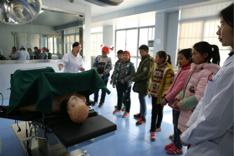 在“走进白衣天使”环节,小朋友们走进护理楼,护理学院韩江红老师带领他们参观了教研室和实验教学示范中心并为小朋友们介绍了相关护理知识:无菌术的重要性、手术服选择绿色是因为它代表了希望。最后,韩老师还带领他们简单体验了护士工作流程的个别环节。