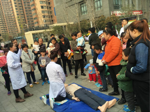 次日下午3时,党支部志愿者们在枫景上东小区开展心肺复苏术的技能讲解和春季流行病的预防措施讲解。志愿者向居民们详细的讲解了心肺复苏及它的重要性及进行连贯动作示范,并向居民讲解什么情况下进行心肺复苏及如何有效的进行心肺复苏。志愿者们还为大家一一解答心中疑虑,手把手进行操作指导。最后,队员们通过自编自演的心肺复苏术小短剧,使大家在欢笑的同时再一次进行了医学知识的学习。