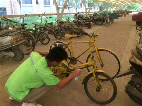 活动结束之际,志愿者返至校园。伴随着新一轮毕业生的离校,滞留校园的“僵尸自行车”开始增多。志愿者们根据赴郑州实践经验,将其进行改造处理,“校园僵尸车”惊变“闪亮小黄蜂”目前,“小黄蜂”放置精诚书院车棚处,实行诚信无锁管理,供师生免费试用。“单车小队”的志愿者将义务、定期对单车进行检查、维护、保养。