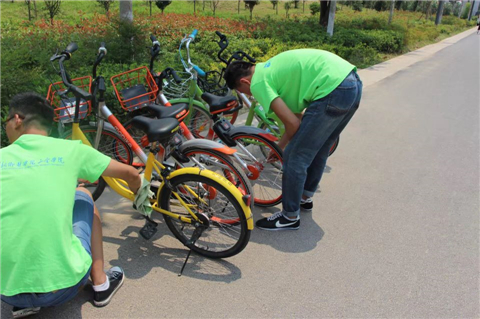 广泛调研的基础上,志愿者们前往郑州各大共享单车租借点。在附近电子屏播放自制“共享单车,共享文明”公益短片暨签字倡议活动,呼吁大家绿色出行,文明用车!在场的很多市民们自发的参与到活动中来。市民王女士表示:自己要以身作则,做环境秩序的维护者。同时,也希望政府可以加强引导,城管能够积极督导,让共享单车可以更好服务市民!在随后的活动中,志愿者发现,单车大多是内胎、座位、踏板、脚架等部件被损坏。然而,单车维修、护理、整治工作量大惊人,工人的数量紧缺。随后的实践活动中,志愿者们踊跃地加入到规范修护“小黄车”的行列中来,热心劝导随意停放单车的使用者,细心摆放被乱停乱靠的单车,用心呵护每一块文明用地。