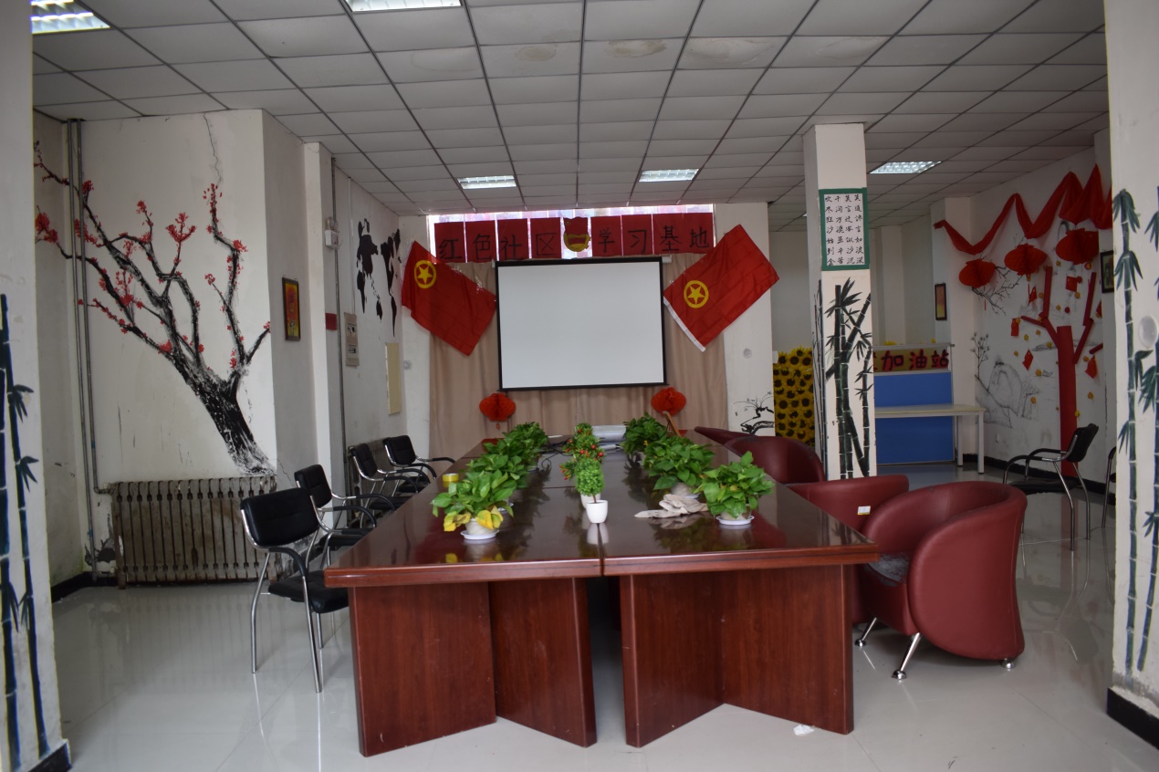 根据其方位将之分为四个区域。东墙是红十月的宣传主题,南墙由暖城加油站,红色革命树,活力团支部三部分构成。北墙由一幅巨型天安门水彩画和一株象征革命战士不畏艰难敢于抗争的红梅组成。位于房间正中的是会议桌,会议桌旁是有两个供讨论的区域。一米阳光的建立是为了培养学生自主解决问题的能力,以及精神的培养。