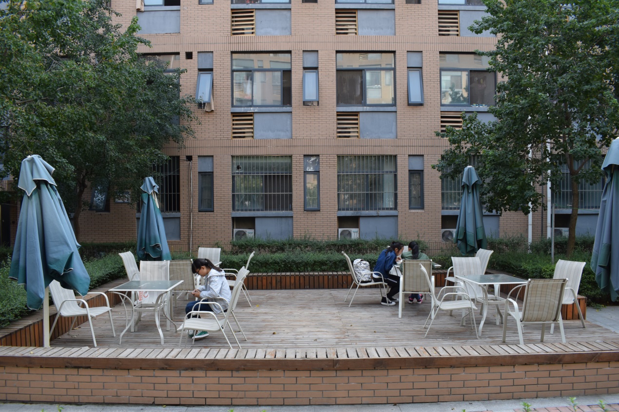 阳光露台位于东U北楼与南楼之间,它的创立是为了给学生提供娱乐、放松、休息等,木制长条状的木板,组成方形的一块地域。圆形玻璃撞的桌子,布制网状的椅子,桌子旁边竖立着绿色的遮阳伞,优雅的设计被赋予了文化的气息。阳光露台它不仅是一个设施,更是让人轻松愉快的空间,阳光正好时,同学们可以在这里看书、聊天、听音乐。