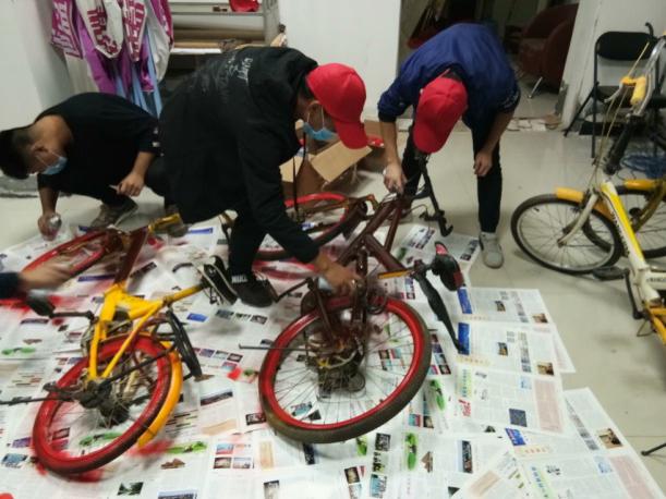 此次展开的实践活动中,志愿者们搜集车棚中的“僵尸车”,并改造“僵尸车”,对车辆进行喷漆、修理。橙色的车身代表着精诚,红色的车轮代表着光辉的党,似火的团,寓意着精诚书院会一直践行党的宗旨,团的号召。