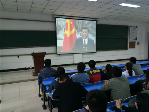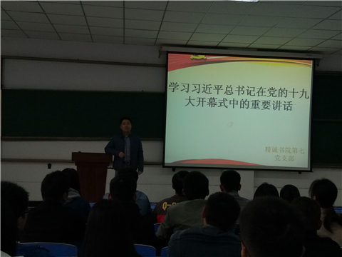 2017.10.25日下午15:10精诚书院第七党支部在问学楼402教室,由第七党支部书记胡国鹏组织本支部观看并学习中国共产党十九大精神。