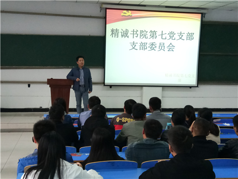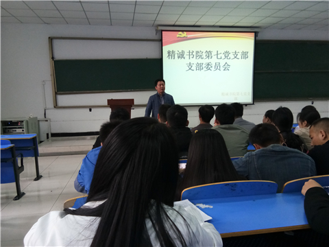 2017年10月25日下午14:30精诚书院第七党支部在问学楼402教室召开支部大会。支部书记胡国鹏书记主持召开并发表重要讲话。