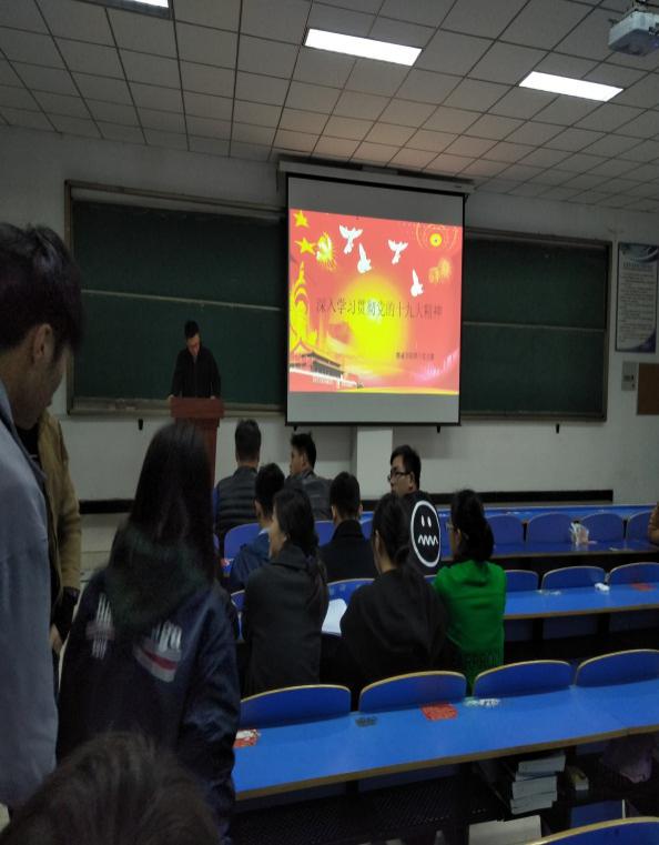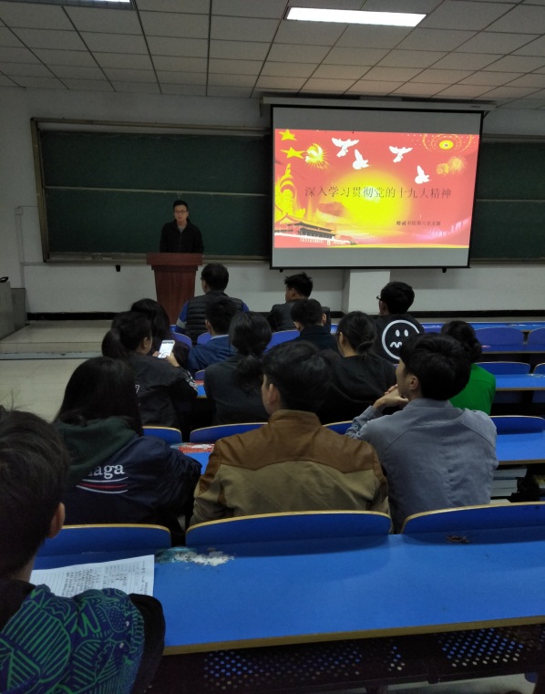 2017年11月14日晚上18:30在问学楼301教室由第六党支部书记姚志博同志召开深入贯彻学习十九大会议精神会议,全体党员参会。