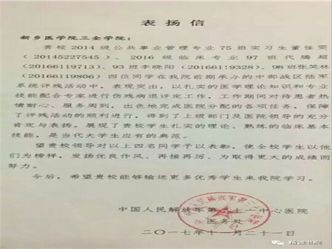 被表扬的代腾超同学是371基地一见习大组长,曾任精诚书院第三届学生会副主席以及精诚书院第一党支部组织委员,在校学习期间曾多次获得荣誉。被表扬的李晓阳同学是371基地一大班团支书,曾获优秀学生干部以及校内三等综合奖学金。被表扬的张笑林同学是371基地一大班大班班长,曾获优秀学生干部。在校期间就如此优秀的他们,在实习期间更是发扬了我院的优良作风。据悉,在中国人民解放军第三七一中心医院前期承办的中部战区陆军系统评残活动中,他们表现突出,以扎实的医学理论知识和专业技能配合专家进行伤残病退评定工作,工作期间他们对患者热情耐心,服务周到,出色地完成医院分配的各项任务,保障了评残工作的顺利进行,得到了上级部门及医院领导的充分肯定与表扬。他们用出色的表现,展现了我院学生扎实的理论和熟练的临床基本技能,弘扬了我院教学的优良传统。