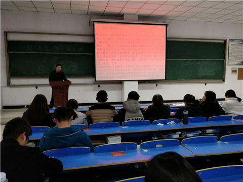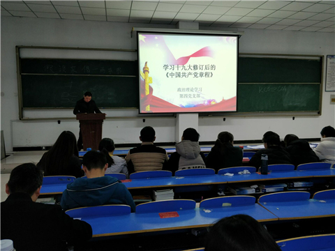 2017年12月14日下午18:00精诚书院第四党支部为了更好的学习党章新要求和新内容,扎实做好党员党性教育于在问学楼501教室召开以“集中学习中国共产党第十九次全国代表大会修正后的《中国共产党章程》”为主题的政治理论学习,参与此次学习的人员有第四党支部党支部书记及其学生党员。