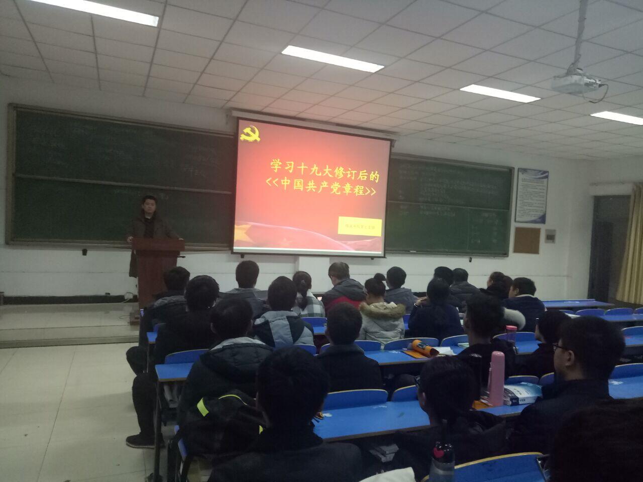 在会议上,党支部书记胡国鹏同志带领全体学生党员就新修订的党的章程认真学习,就此次党章修订有党员发表了看法,说党的面貌更是焕然一新,并真切的感受到党的进步。其他党员也纷纷发表了自己的心得和体会。