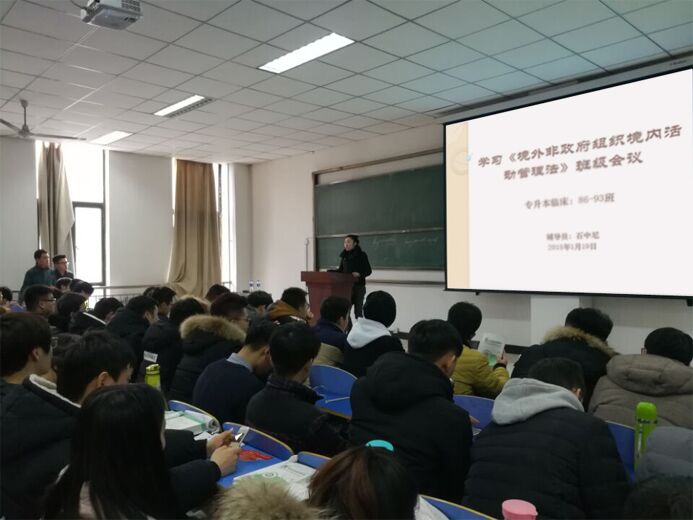 为深入贯彻落实党的十九大精神,深化依法治国的方针政策,加大全民普法的力度,推进《管理法》的有效实施,巩固在豫“境外非政府组织依法登记备案”常态化,2018年1月19日精诚书院新乡校区辅导员石中尼老师,在问学楼301教室为2017级临床一大班开展学习“境外非政府组织境内活动管理法”主题班会。