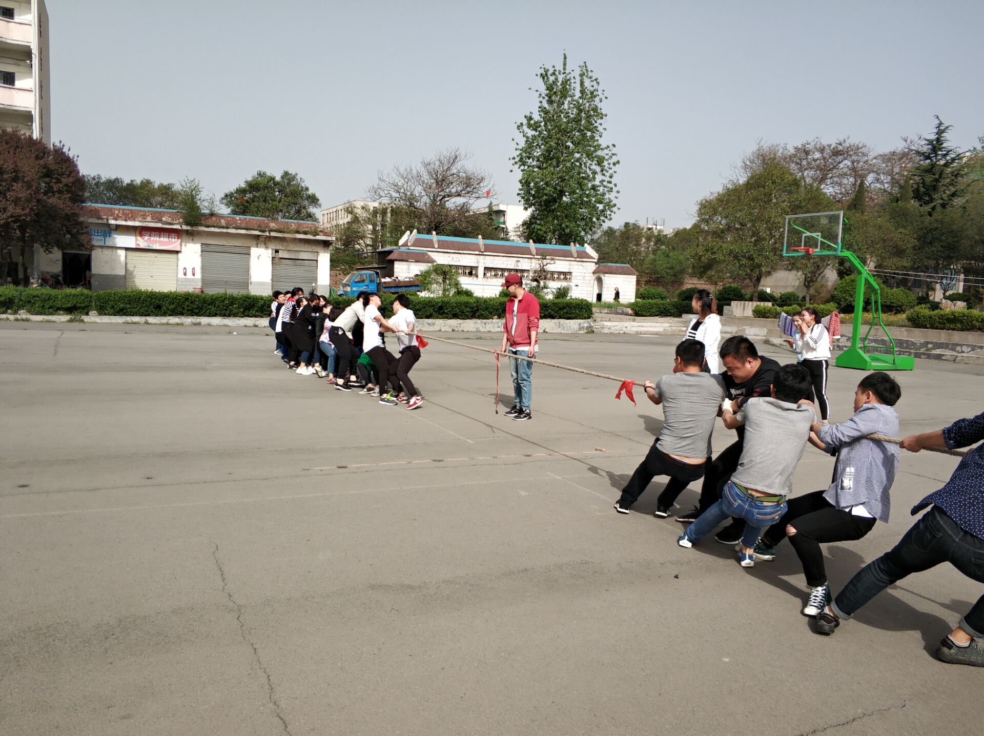 先举行的是全班拔河比赛,比赛实行淘汰制晋级方式,抽签分组决定比赛顺序。以小班级为单位分8组,每队10男10女参赛。当比赛的哨声一响起,队员们口中一齐高呼着“一二,一二”,双手紧握长绳,憋足了劲拼命往后拉,号子声、呐喊声,此起彼伏,飘荡在整个篮球场上空。