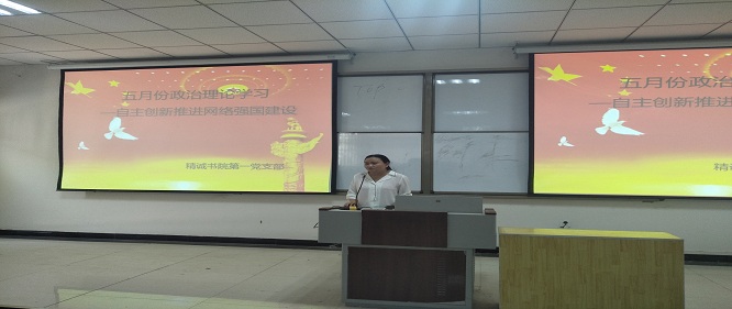 为了积极响应学校党委号召,进一步深入学习自主创新推进网络强国建设的重要性,5月14日上午,精诚书院第一党支部于371教学基地第一大教室召开了主题为“自主创新推进网络强国建设”的政治理论学习,会议由支部书记杨卫红主持,全体党员、预备党员出席了本次会议。
