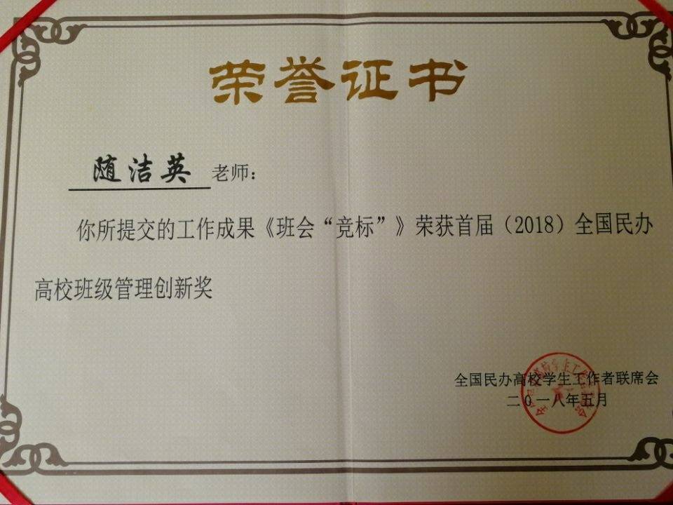 5月10日,首届“全国民办高校班级管理创新奖”获奖名单揭晓,我书院辅导员随洁英的《德育“创新”再出发,班会“竞标”展风采》班级管理案例脱颖而出,获得了首届全国民办高校班级管理创新奖。