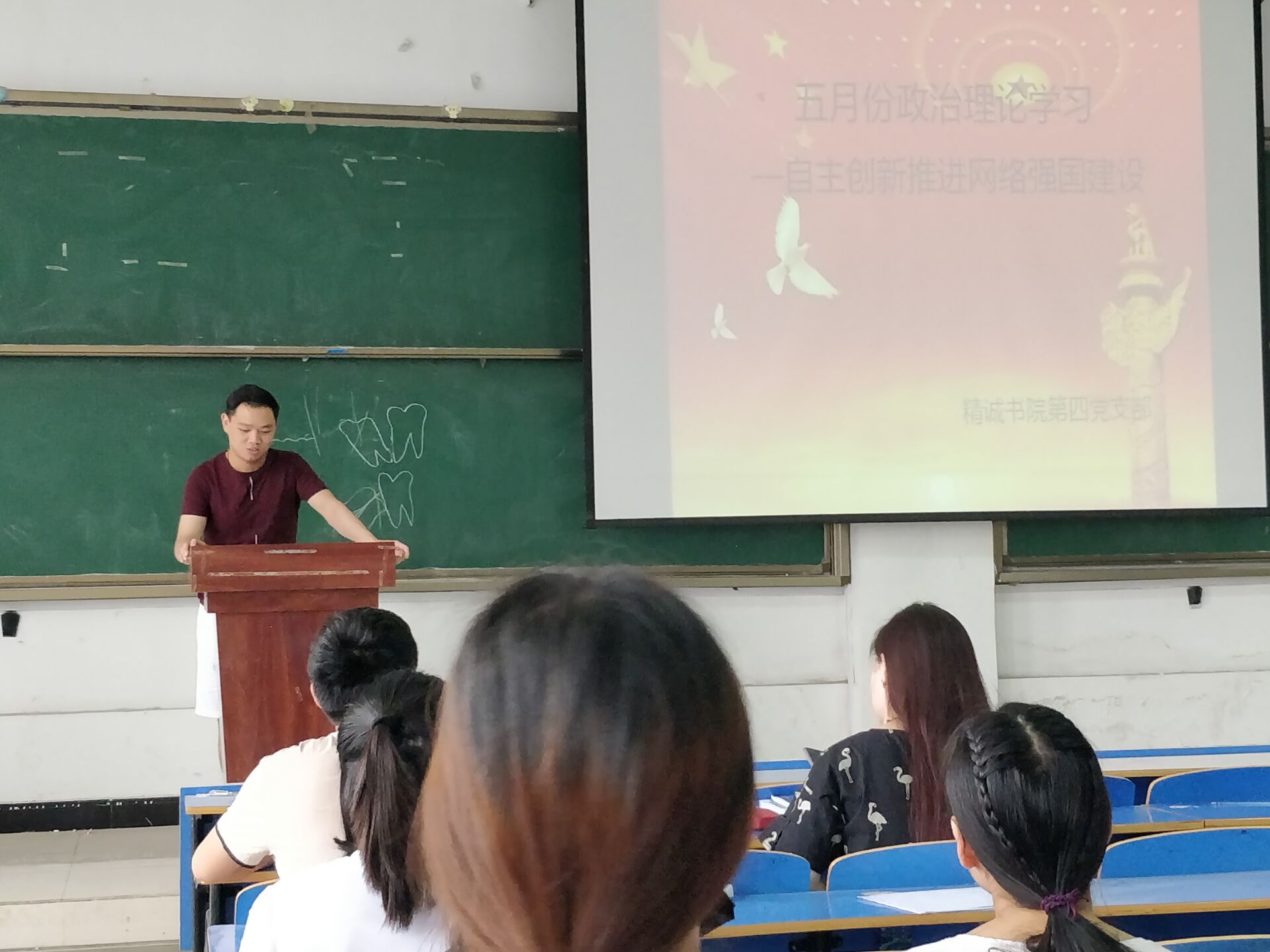 为了学习贯彻习近平总书记“自主创新推进网络强国建设”,精诚书院学生第四党支部全体成员于2018年5月14日下午16:00在问学楼502教室召开“学习自主创新推进网络强国建设”的专题政治理论学习。