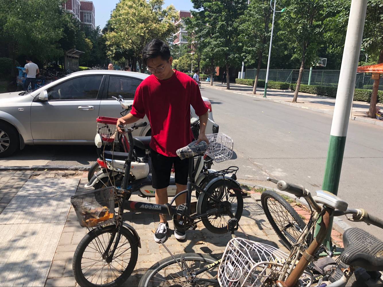 学生们上午10点准时开始他们的志愿活动。虽然烈日炎炎,但是完全没有影响到志愿者们的热情。这次活动中志愿者们积极地参与到活动中,对于重量大的电动车大家齐心协力一同将其摆放整齐。在志愿者们齐心协力的努力下,停车区重回整齐的模样。