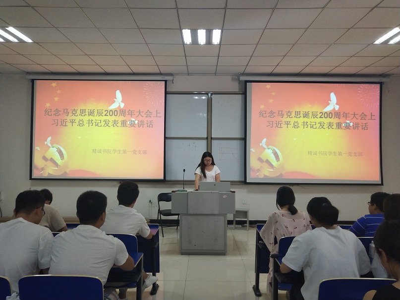 6月11日,精诚书院学生第一党支部于371教学基地第一大教室开展了以“纪念马克思诞辰200周年”为主题的政治理论学习,会议由精诚书院学生第一党支部书记杨卫红主持,全体党员、预备党员出席。