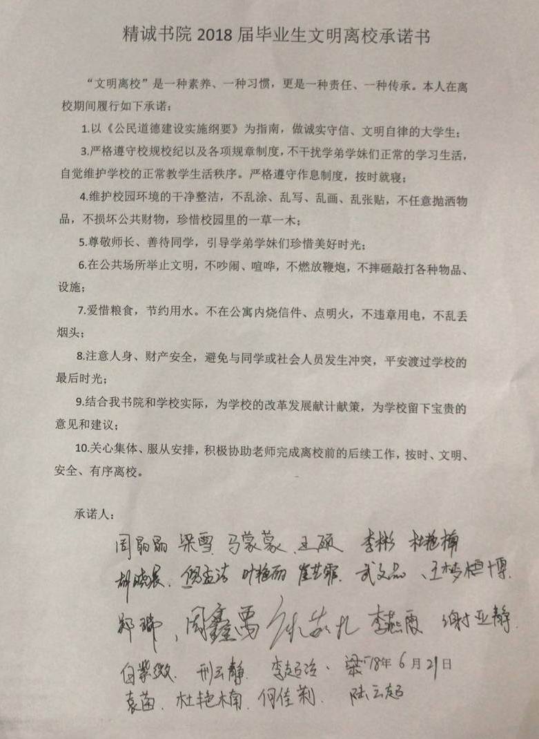 班会上,辅导员老师对毕业离校期间的纪律和安全问题进行了强调,要求同学们遵守宿舍管理规定,按时作息,保持卫生,确保安全文明离校。希望毕业生在校的最后时间里,能遵守校规校纪,爱护学校一切公共设施,做道德高尚、举止端庄、语言文明的人,为顺利毕业做出自己的贡献。随后,辅导员老师组织毕业生签订《精诚书院2018届毕业生文明离校承诺书》。