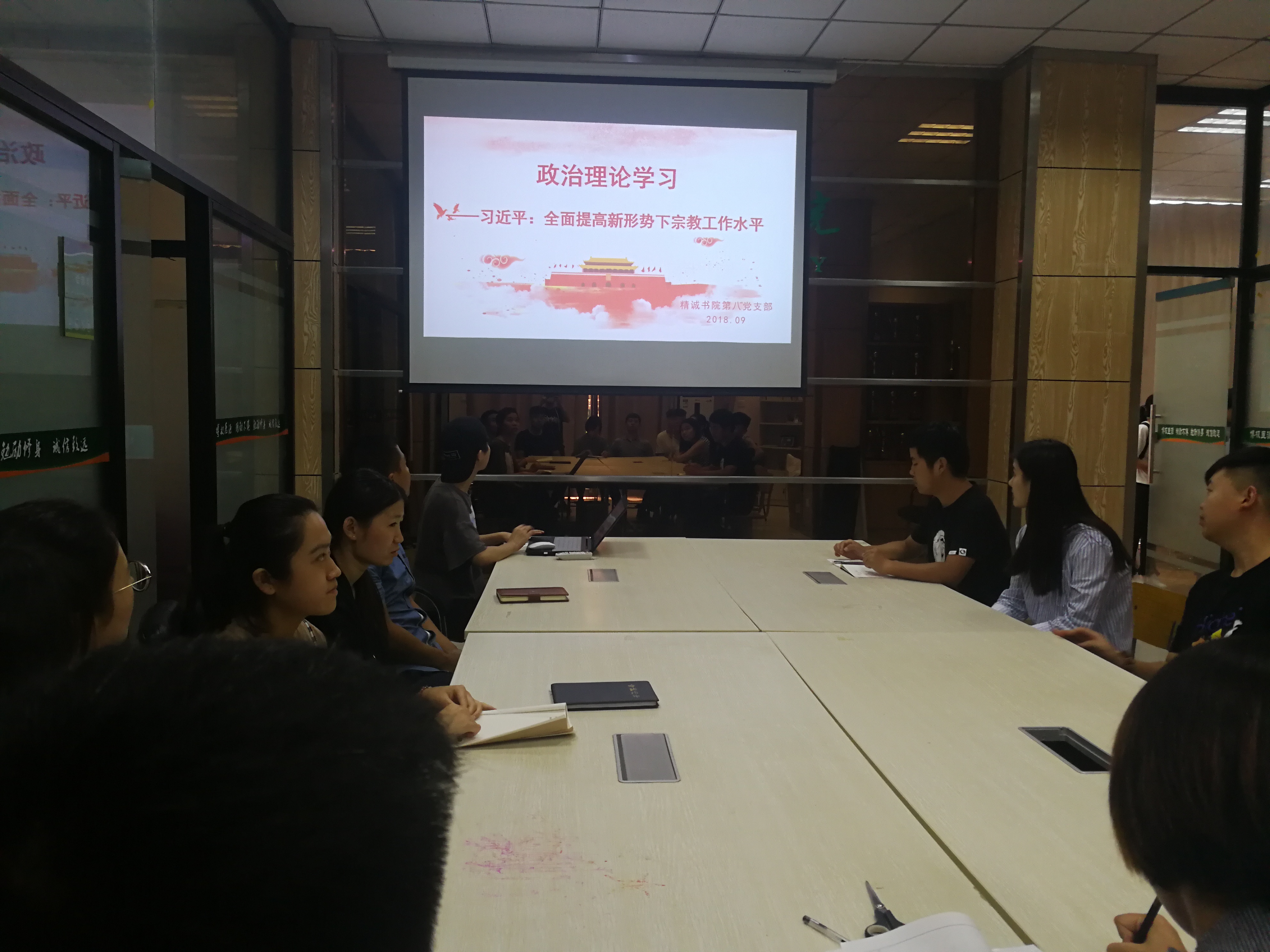 2018年9月17日,学生第八党支部于精诚书院会议室召开了以学习“习近平:全面提高新形势下宗教工作水平”重要讲话精神为主题的政治理论会议。参会人员有第八党支部书记张阳同志以及所有在校党员。