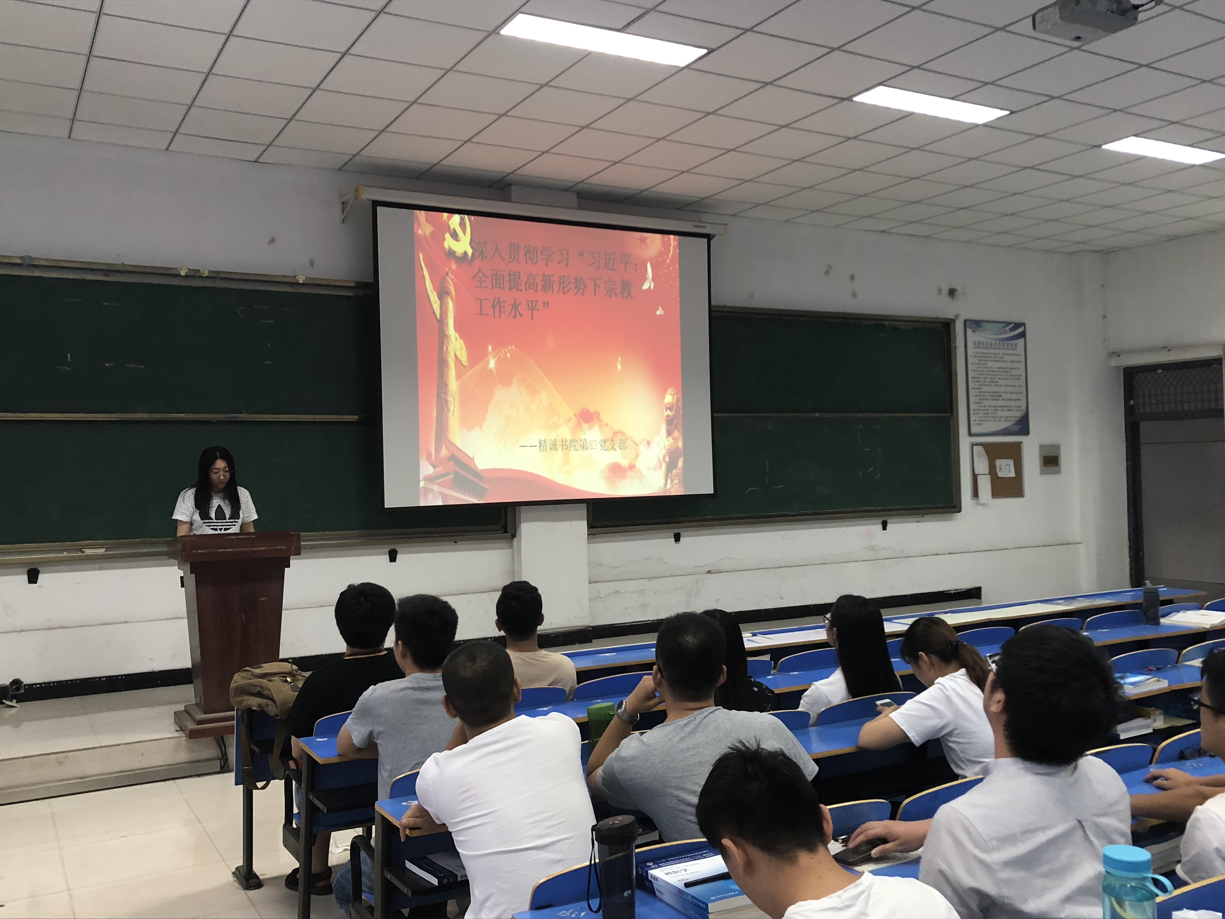 9月10日下午,在党支部书记石中尼带领下精诚书院第二党支部全体党员于新乡校区问学楼502教室,以“深入贯彻学习习近平总书记关于宗教工作的重要论述”为主题进行了本月政治理论学习。