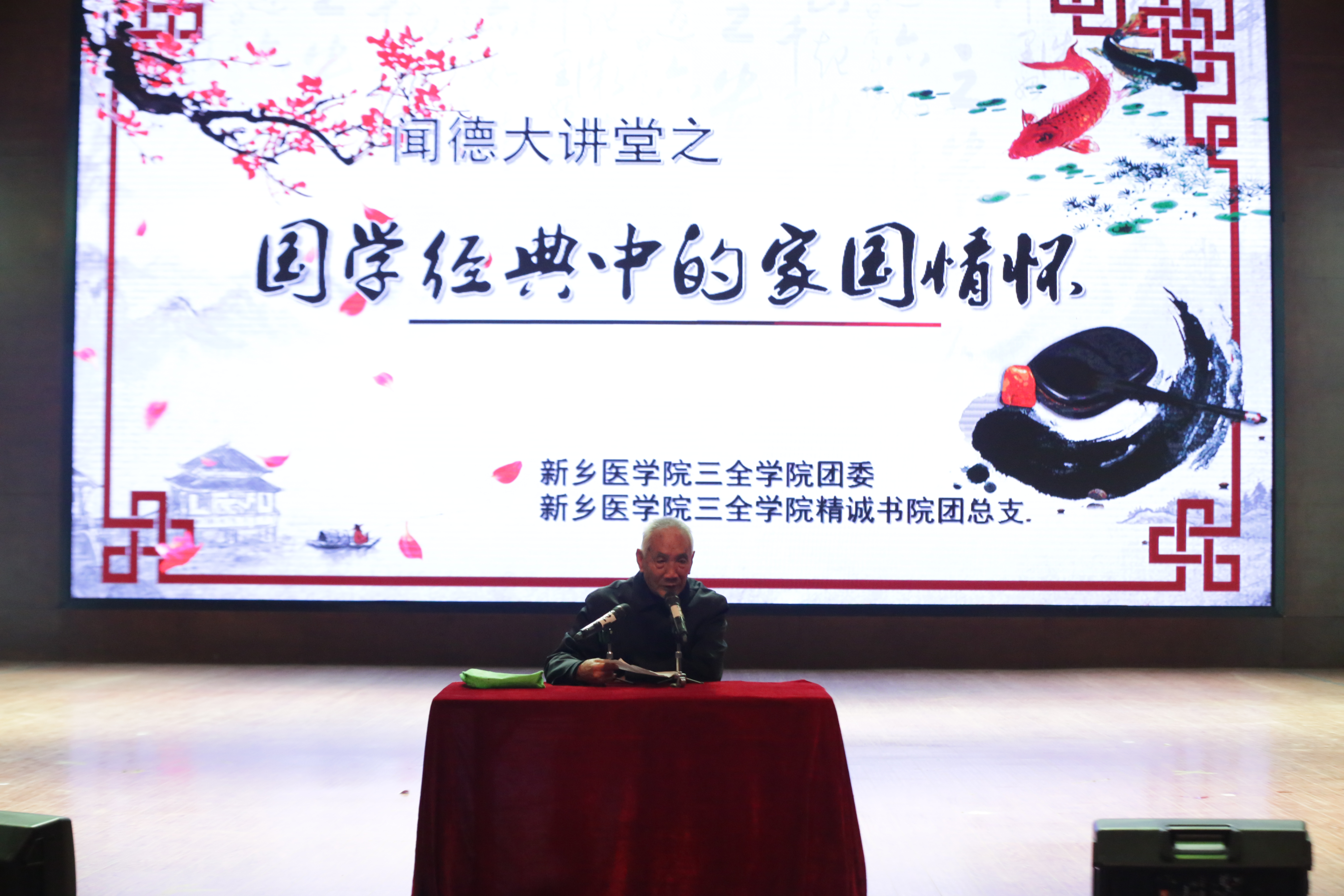 为全面贯彻落实习近平总书记全国教育大会讲话精神,坚定广大青年学生理想信念,在学校教育中厚植爱国主义情怀, 10月23日,我校特邀颜景松教授做客闻德大讲堂,开展“国学经典中的家国情怀”专题讲座。新乡医学院三全学院学务长邱永建、团委书记马素娟、精诚书院党总支书记张新、党总支副书记万建苗及近千名学生聆听了此次讲座。