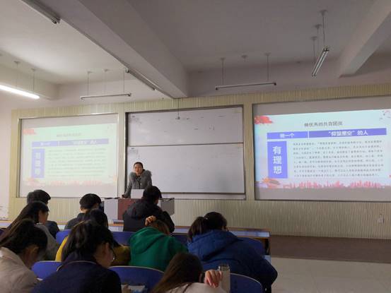 杨老师,从四个方面阐述了十九大精神:习近平新时代中国特色社会主义思想的解读、当代社会信仰――践行社会主义核心价值观、感悟马克思真理力量、做优秀的共青团员。其中,她就如何做当代优秀的共青团员进行了重点阐述:身为一名当代的大学生一定要有理想、敢担当、不保守、肯付出。首先,她鼓励大家要做一个仰望星空的人,一个有追求的人。接着,她语重心长地告诫同学们一定要勇于担当,在校期间提前准备好各种“干货”――组织协调能力、吃苦耐劳能力、创新创业能力、科研能力等等。做到人无我有,人有我优。