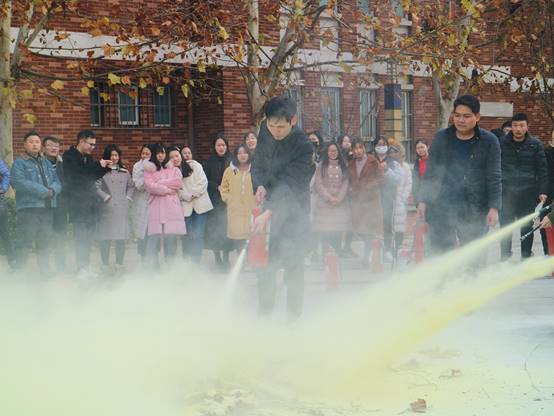在活动起初,王聪老师给大家科普了消防知识,并讲述火灾的基本注意事项和逃生技巧。在此期间,他还通过列举相关事例,使得大家认识到安全使用电器的重要性。接着详细讲解了各种消防自救器材的用途、使用方法及注意事项,以避免在火灾发生时造成更大的危害。王聪老师提到灭火器和消火栓是扑救初起火灾的利器,平时要经常检查,检查时要注意灭火器压力表是否指在绿色区域,并且要确保其的完整性与适用性。最后,王聪老师介绍了灭火器的使用方法:使用灭火器时,四步要牢记:一提,提起灭火器;二拔,拔下保险销;三对准,对准火源根部;四压,按下压把扫射灭火。在介绍结束后,他为了使得讲解更加生动形象,特向大家演示了手提式干粉灭火器的用法。