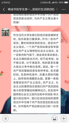 12月7日,精诚书院学生第一党支部于微信群开展了以学习“中国共产党发展党员工作流程”为主题的政治理论学习,会议由杨卫红书记主持,全体党员及预备党员共同参与讨论。