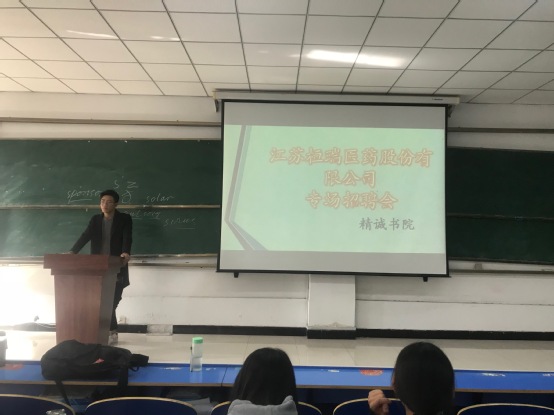 为了进一步的促进书院毕业生就业,精诚书院于4月27日在新乡校区问学楼301教室举办了江苏桓瑞医药有限公司的专场招聘会,这次招聘面向的是药学、药物制剂等专业毕业生。
