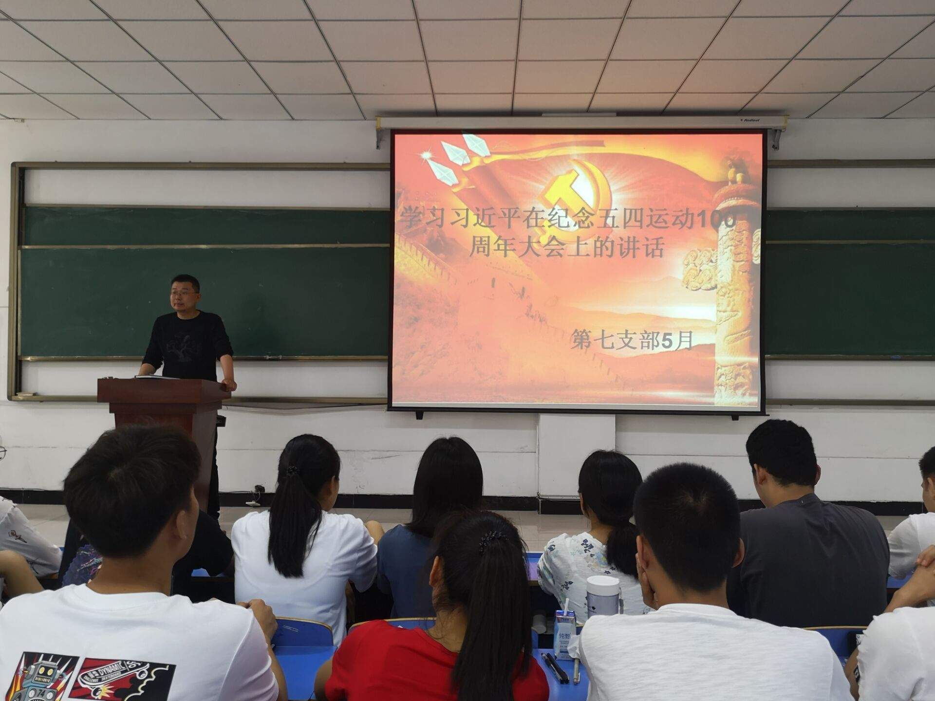 在支部书记秦磊老师的带领下,所有党员对五四新精神进行了认真学习和深刻解读:今年是五四运动100周年,也是中华人民共和国成立70周年;划时代的事件,并不因时间的推移而褪去颜色;五四新文化运动孕育了爱国、进步、民主、科学的伟大精神;一代代的“新青年”用青春甚至生命不断探索,从黑暗走向光明,急起直追。作为新时代的党员我们一定要起到先锋模范带头作用,应该有使命感,不断学习、艰苦奋斗、修为自身、敢于争先,用拼搏和奋斗跑好建成社会主义现代化强国,实现中国梦的接力赛。
