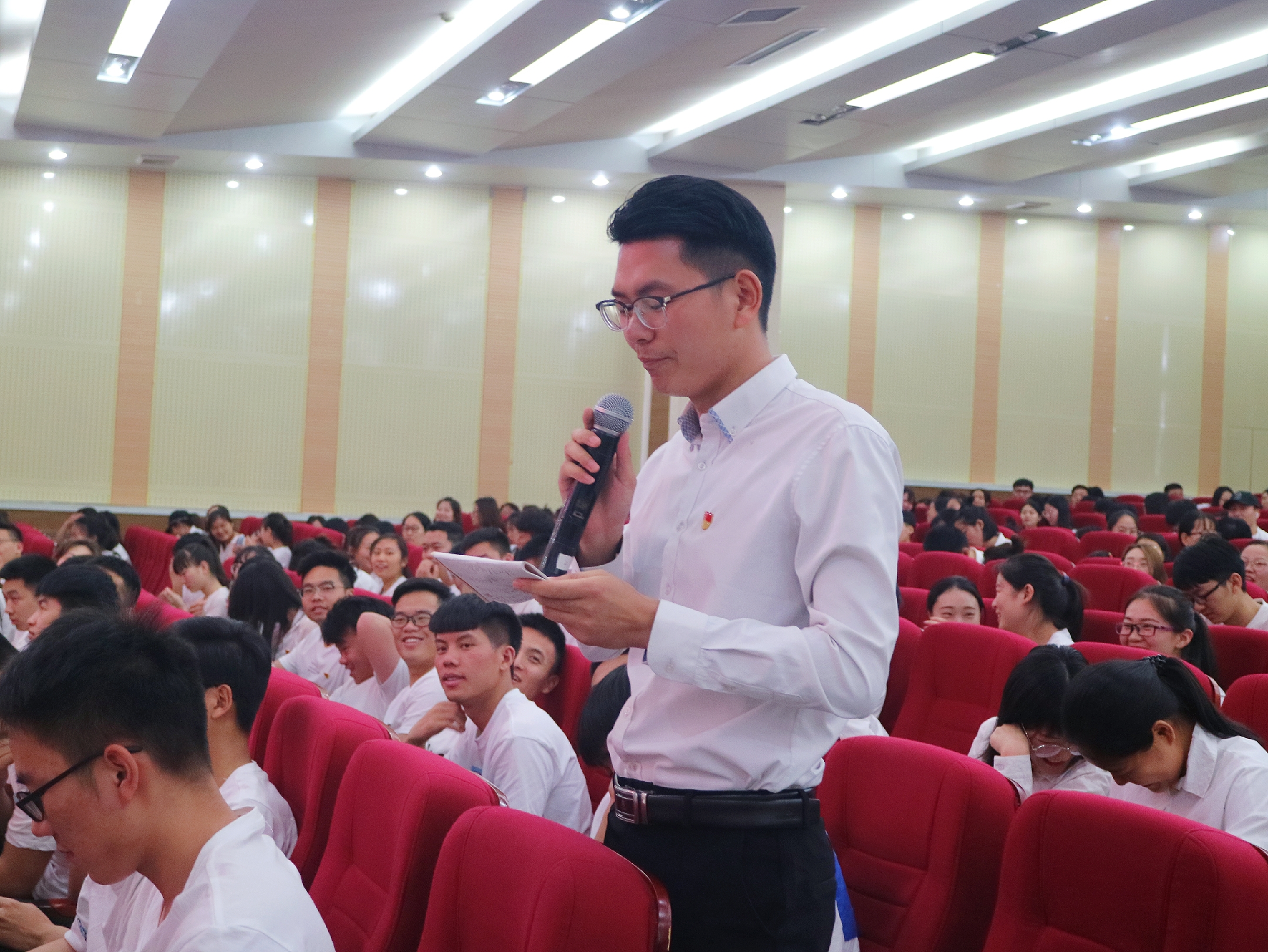 互动环节,党员代表苑强问道:“卢书记,听了您的分享我深有感触,也意识到自己身为党员应拥有的使命感,那么您认为当代大学生应该如何更好地坚守初心、牢记使命呢?”卢运道书记解答道:“作为新时代的青年,应永远铭记历史,永远记得自己当初的选择,并时刻谨记自己的责任,脚踏实地一步一步走,学好学业、报效祖国,从而更好地实现伟大复兴的中国梦。”