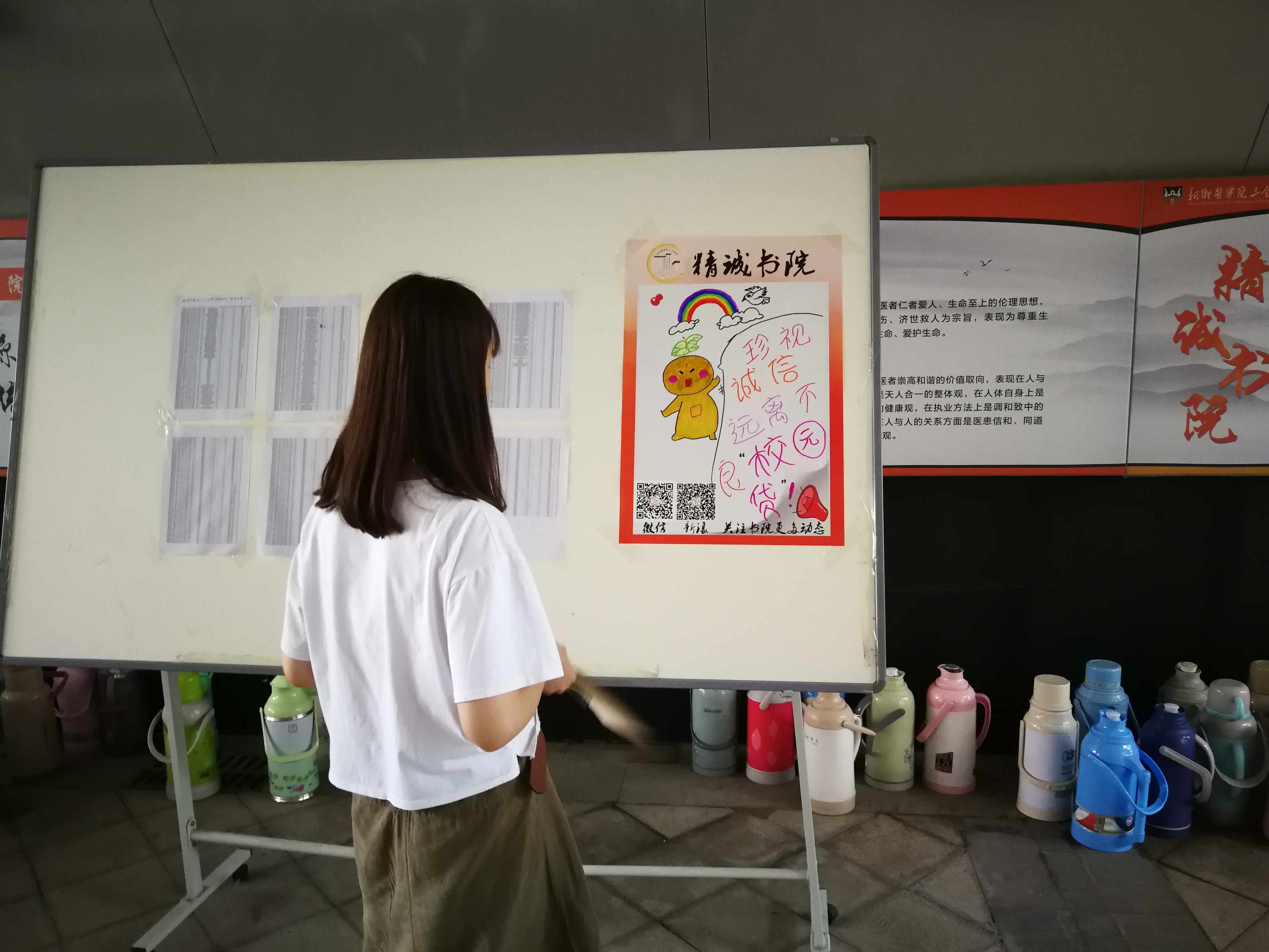 为进一步加强大学生诚信教育,普及相关金融及借贷知识,增强家大家的诚信意识,6月16日-25日,精诚书院开展了“珍视诚信,远离不良‘校园贷’”主题教育活动。