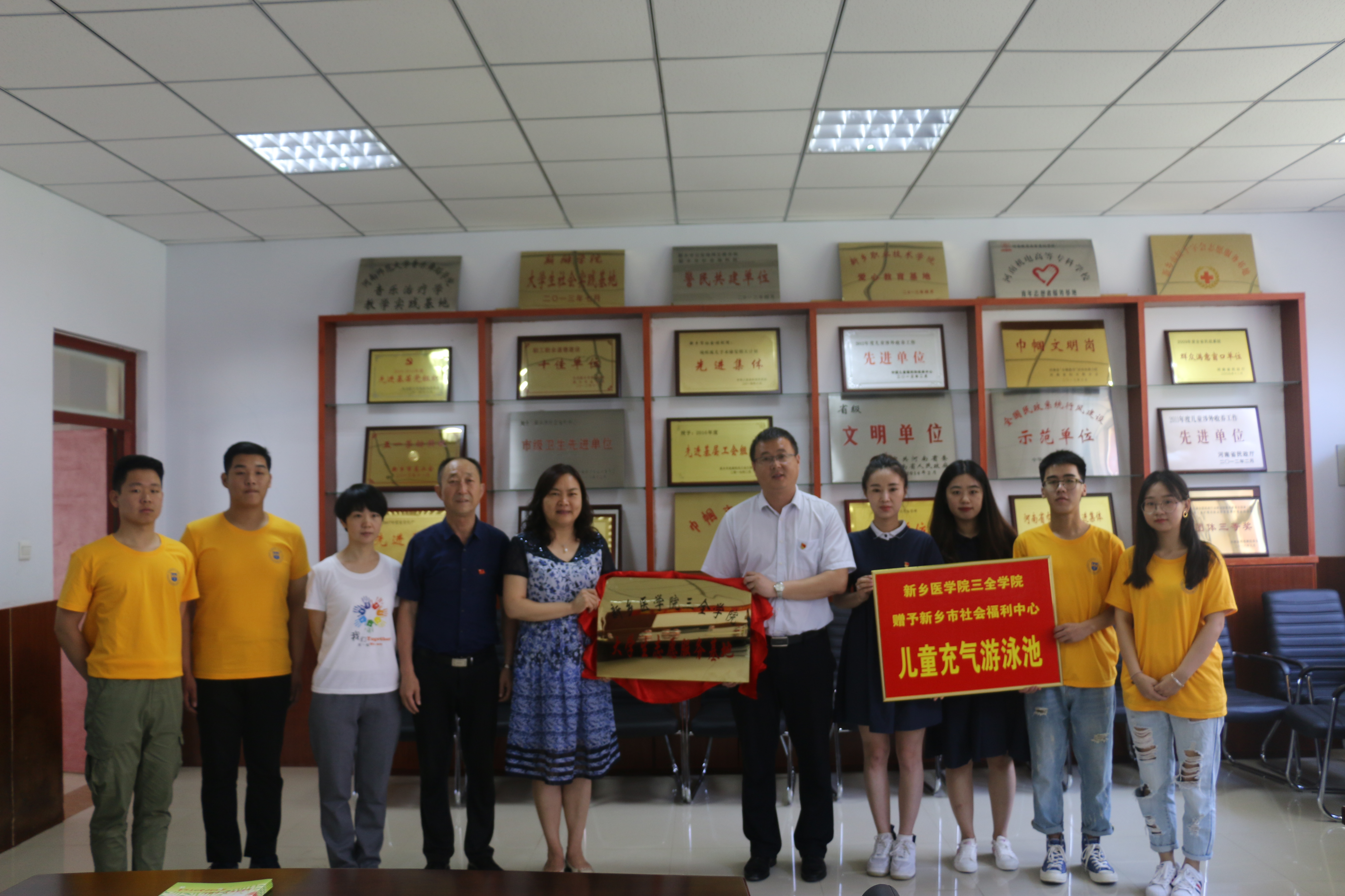在此次挂牌仪式之前,新乡医学院三全学院志愿者们通过杨彬主任了解到,福利院的孩子们平时外出机会较少,所以孩子们在酷热的夏天极其渴望有一个小型的游泳池,于是,在学校社会实践重点团队物资的支持下,为孩子们申请到两个儿童充气式游泳池,并在挂牌仪式上,移交给新乡市社会福利中心,圆了孩子们的游泳梦,希望孩子们能度过一个凉爽的夏日。