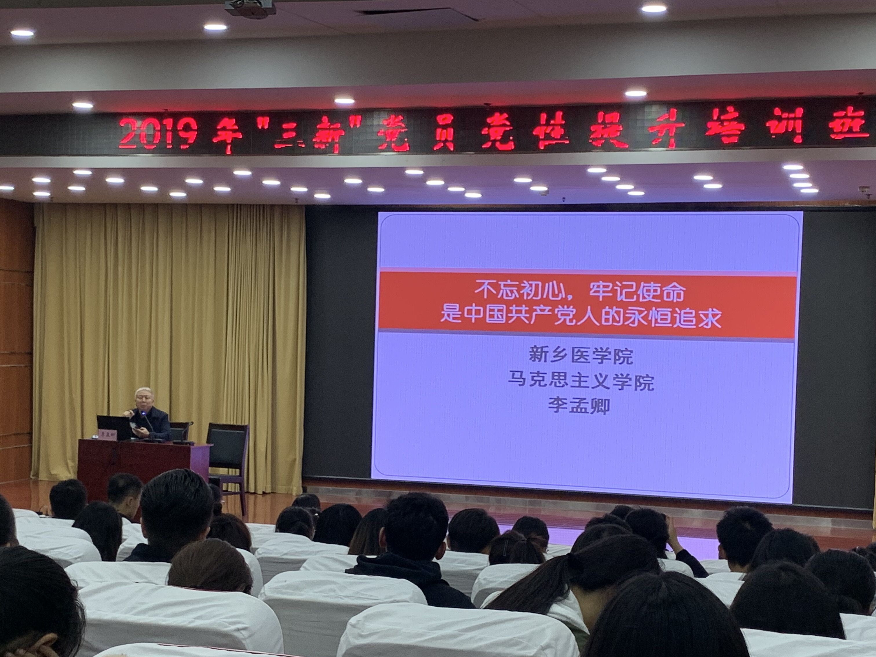 11月7日下午3时,精诚书院党总支“三新”党员在新乡医学院第一报告厅参加了“三新”党员党性提升培训班,此次培训班面向2019年新发展的师生党员、新入职的教职工党员以及新入学的新生党员,旨在贯彻落实“不忘初心 牢命”主题教育精神,强化入党初心,提升党员责任感 。与会的“三新”党员通过听专题党课、佩戴党徽、重温入党誓词、唱国歌和国际歌、分组讨论学习体会,交流分享学习心得等多种形式,使党员意识得到进一步增强,党性修养得到进一步提高。