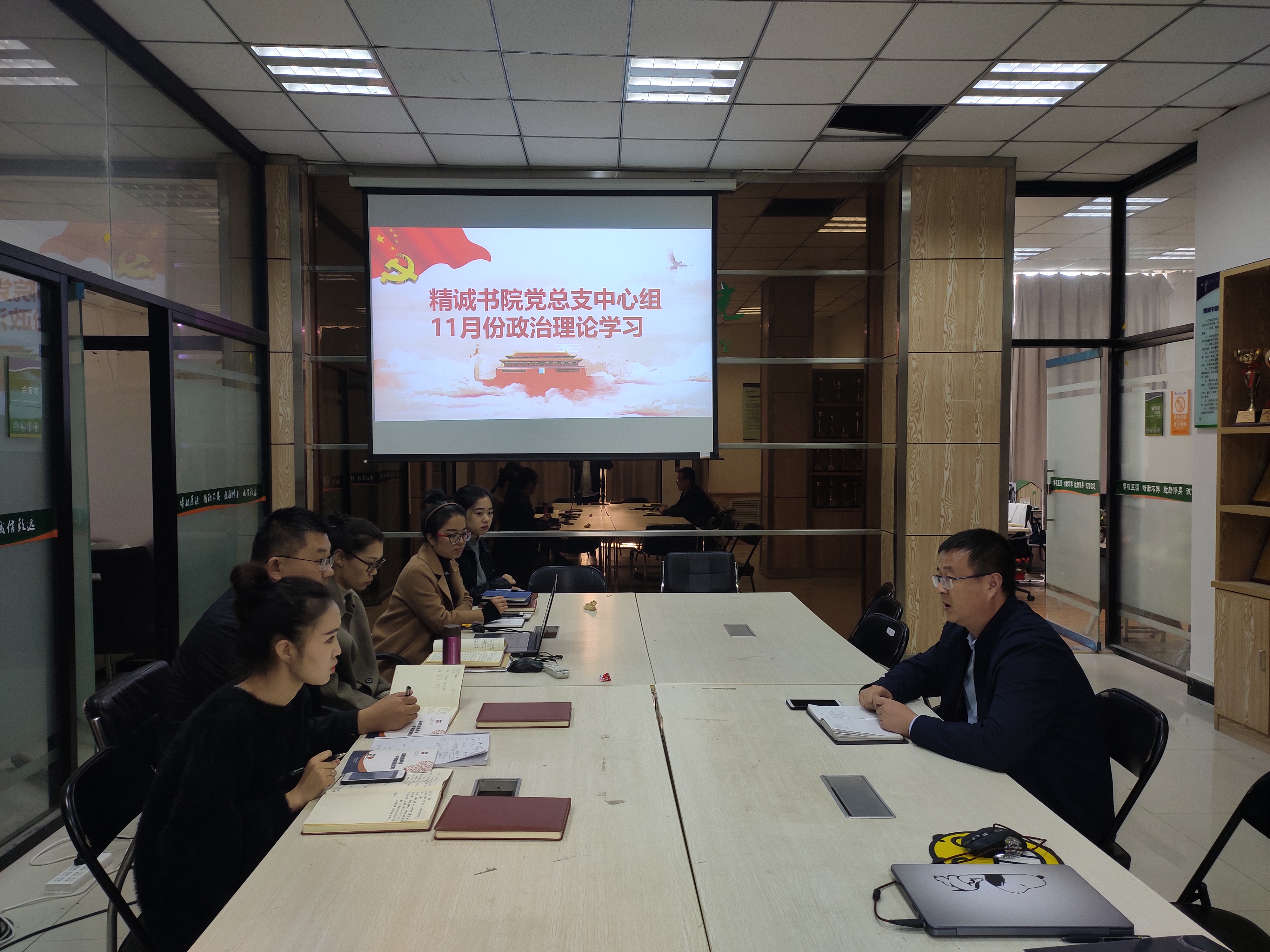 根据精诚书院党总支中心组政治理论学习安排,为深入学习贯彻习近平总书记在十九届四中全会重要讲话精神,结合“不忘初心、牢记使命”主题教育的工作安排,11月5日上午,党总支中心组在精诚书院会议室开展十一月份政治理论学习,集中学习了十九届四中全会公报和习近平总书记的重要讲话。会议由张新主持,党总支中心组全体党员参加。