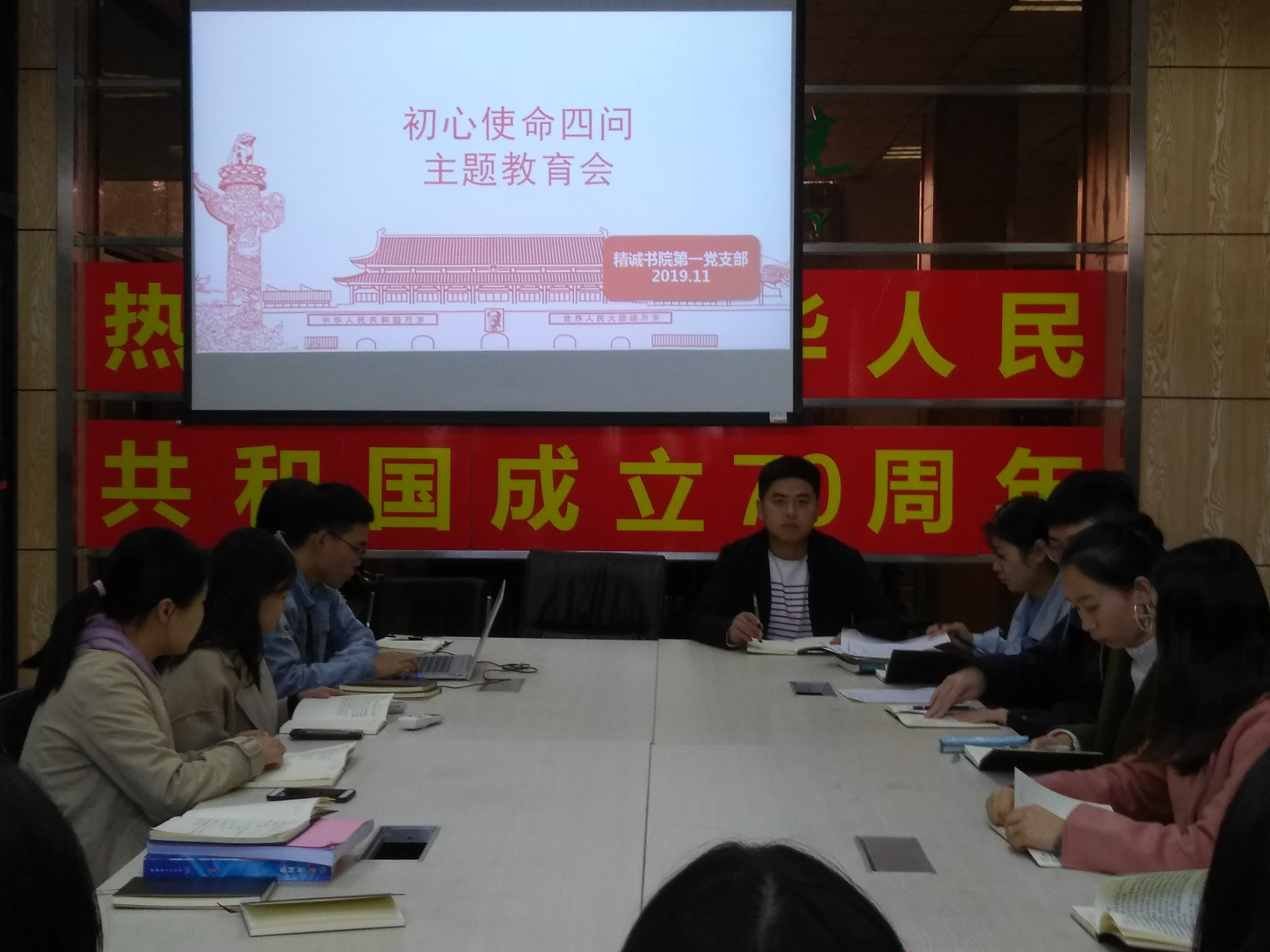 2019年11月18日中午,新乡医学院三全学院精诚书院第一党支部全体学生党员于精诚书院办公室开展了“初心使命四问”的主题党日活动。会议由支部书记张阳主持,党支部全体师生党员参加了会议。