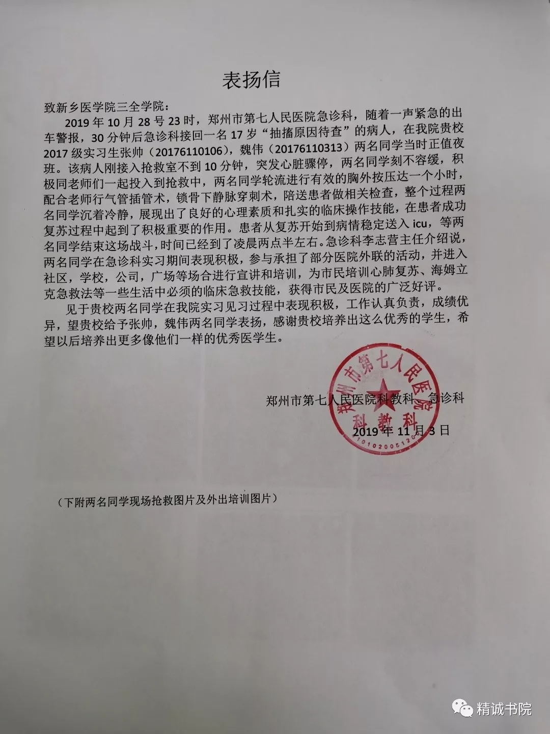 近日,我院收到来自郑州市第七人民医院的表扬信,对我书院张帅、魏伟两同学在实习过程中的优秀表现给予高度赞扬!