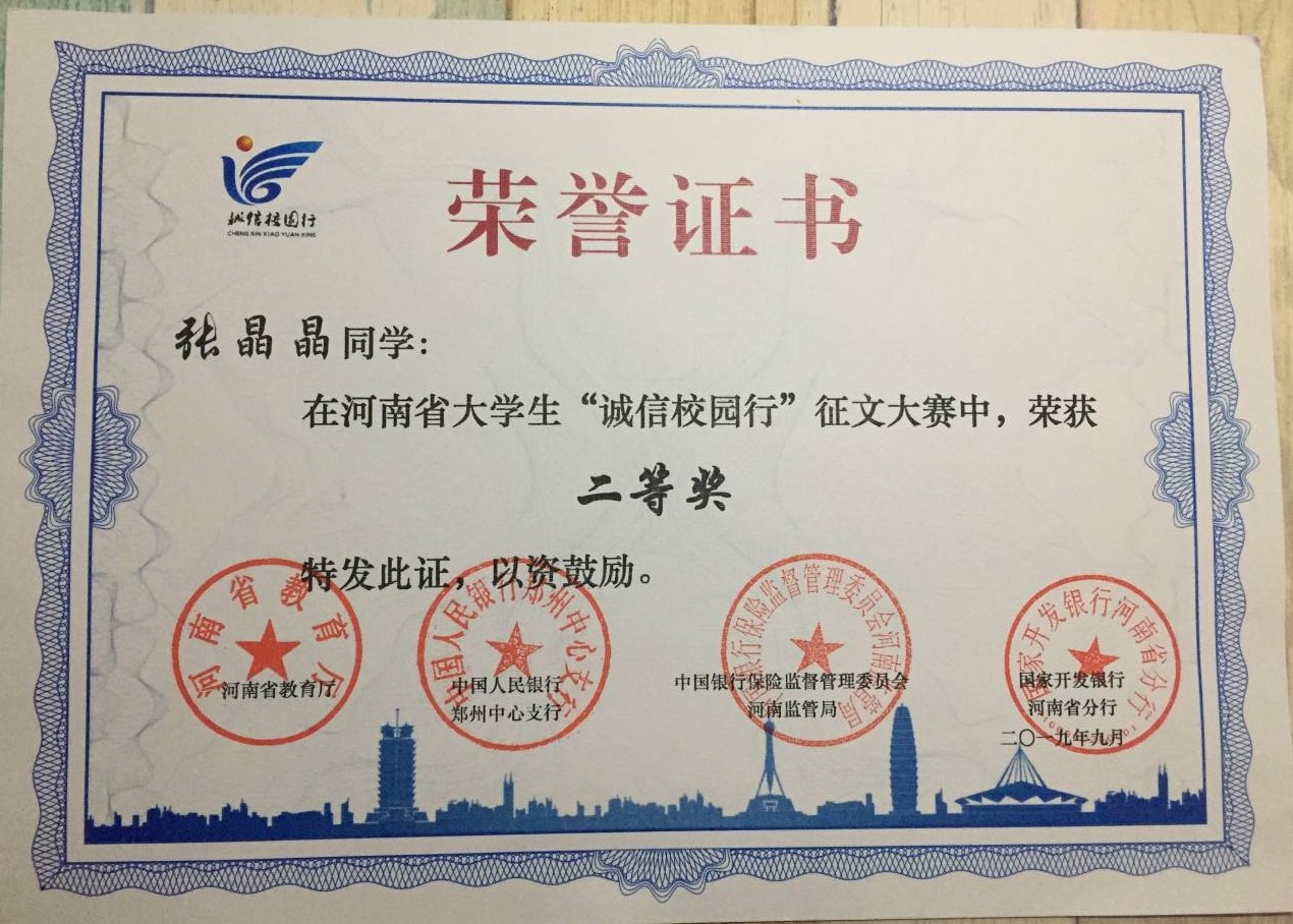 由河南省教育厅、中国人民银行郑州中心支行、中国银行保监会河南监管局、国家开发银行河南省分行联合举办的河南省大学生“诚信校园行”征文大赛活动评选结果揭晓,我校1项作品获奖为精诚书院2018级临床医学专业张晶晶作品《一切很美只因有你——祖国》荣获二等奖。