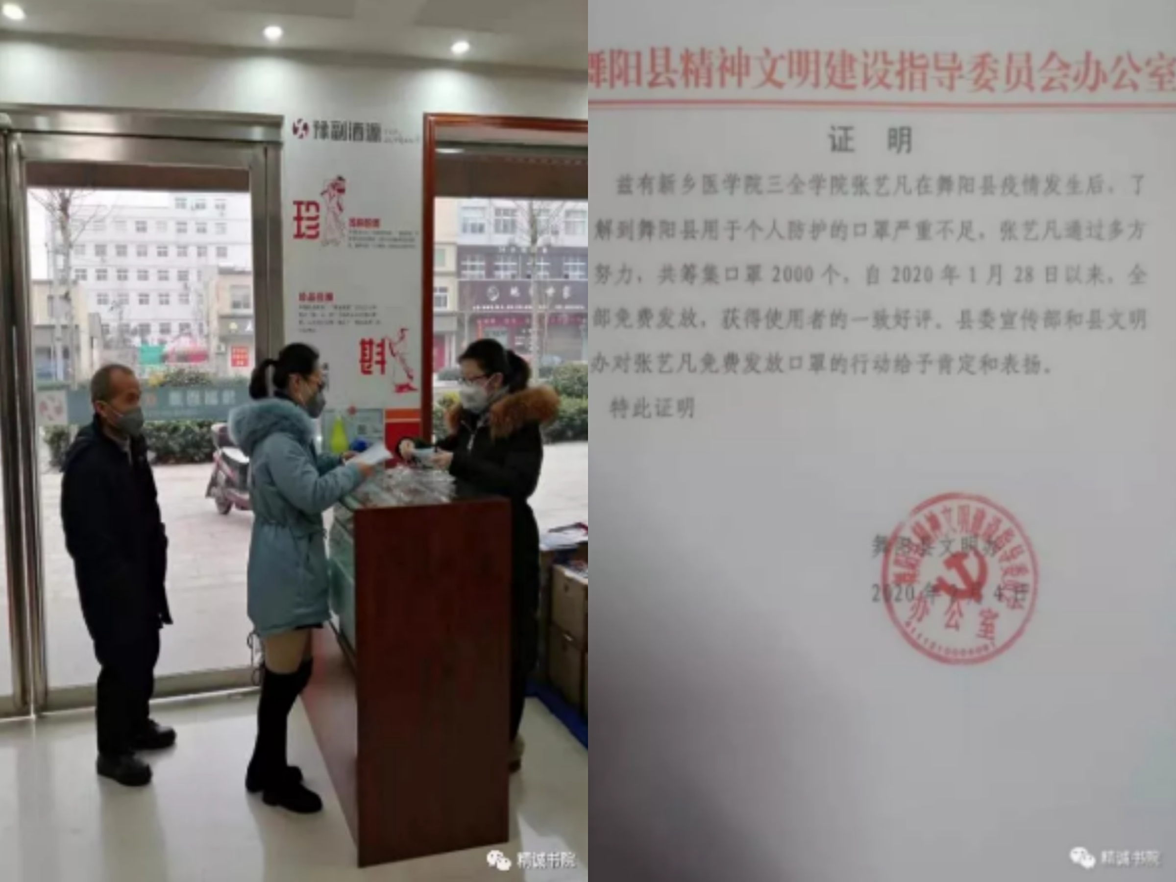 张艺凡,精诚书院2017级专升本临床医学专业学生。疫情发生后,实习放假回家的她发现自己所属的县城用于个人防护的口罩严重不足,于是她便开始在网上搜索了好多生产厂家的电话,一天打了三十多个电话,但都以被告知没有口罩结束,后来通过自己的一个阿姨找到了熟人,费劲心思,最后共筹集口罩2000个,自1月28日以来,每天以在家中的连锁商店为中心点免费发放,获得村民的一致好评,县委宣传部和县文明办得知情况后,亲自到店了解情况,对她免费发放口罩的行动给予肯定和表扬。