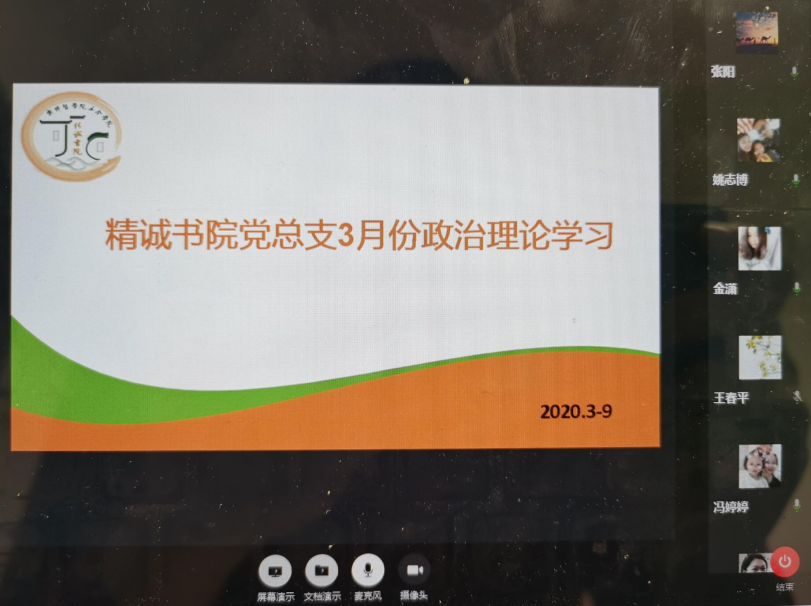 3月9日,精诚书院党总支通过企业微信,以视频会议形式开展了3月份政治理论学习。党总支全体成员共同参加视频会议,会议由张新书记主持。