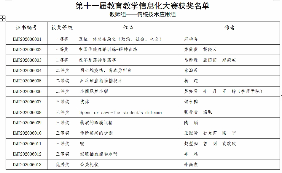 新乡医学院三全学院第十一届教育教学信息化大赛按照预定方案和规定程序,经各教学单位选拔推荐、专家评审、院务会审定,共评选出各类奖项