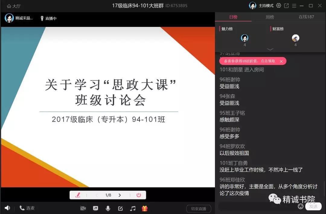 精诚书院辅导员老师们通过各种在线平台以及主题班会等载体,在课后和同学们分享讨论,帮助学生进一步增强了对战胜疫情的信心决心,增进了对中国共产党的领导和中国特色社会主义制度的政治认同、思想认同、理论认同、情感认同。同学们纷纷表示作为新时代的青年学生要传承和弘扬伟大的爱国主义精神,更加积极地肩负起新时代的责任和担当,不仅在学业修为上只争朝夕、砥砺奋进,也要在力所能及的情况下,积极为抗疫防疫贡献智慧和力量,努力为中华民族的伟大复兴添砖加瓦。