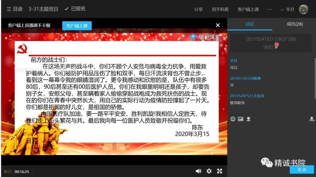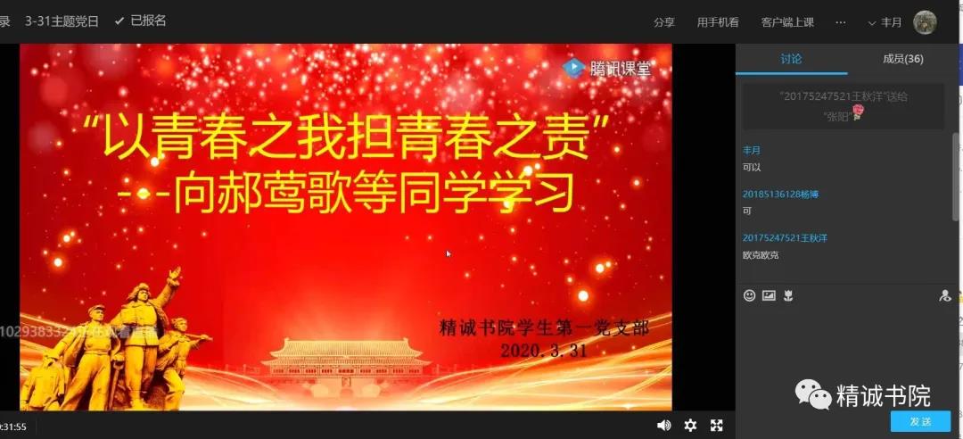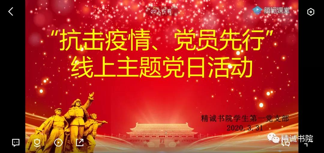在新冠肺炎疫情防控阻击战中,为响应习近平总书记向全党发出的号召“让党旗在防控疫情斗争第一线高高飘扬”,进一步强化我校各级党组织战斗堡垒作用和党员先锋模范作用,3月31日,新乡医学院三全学院精诚书学生第一党支部开展“抗击疫情、党员先行”线上主题党日活动,活动由支部书记张阳主持,党支部师生党员参加了本次活动。