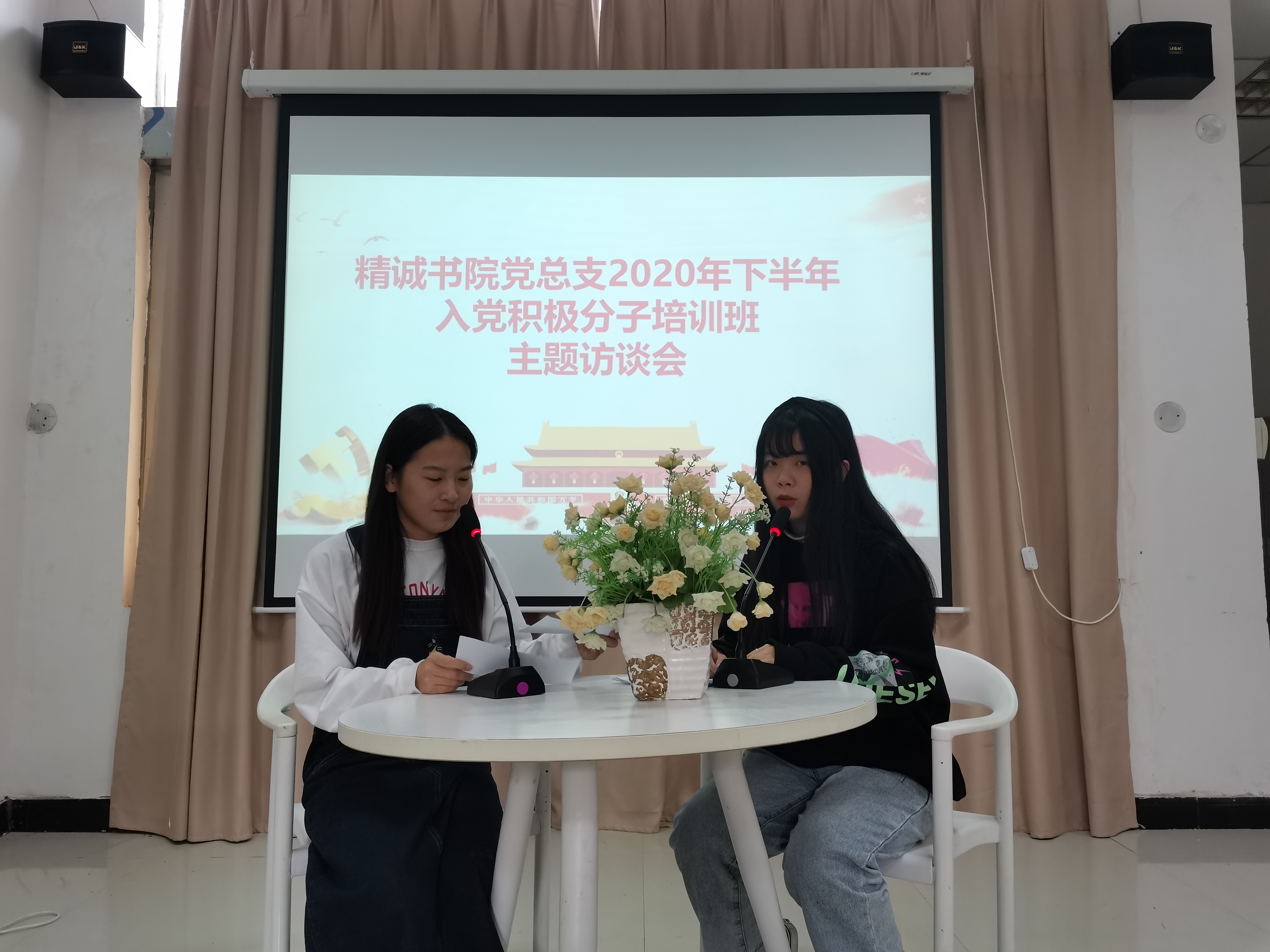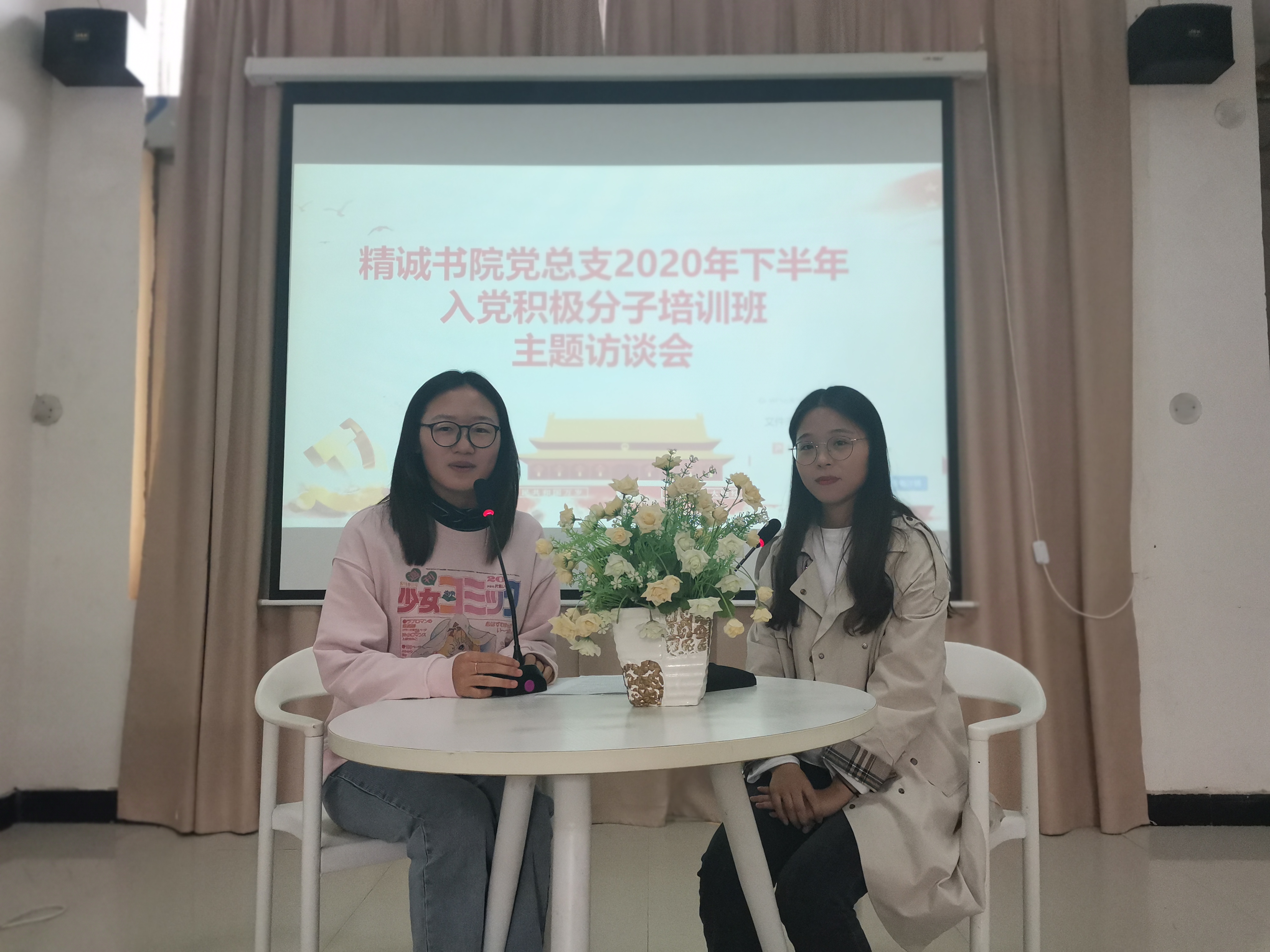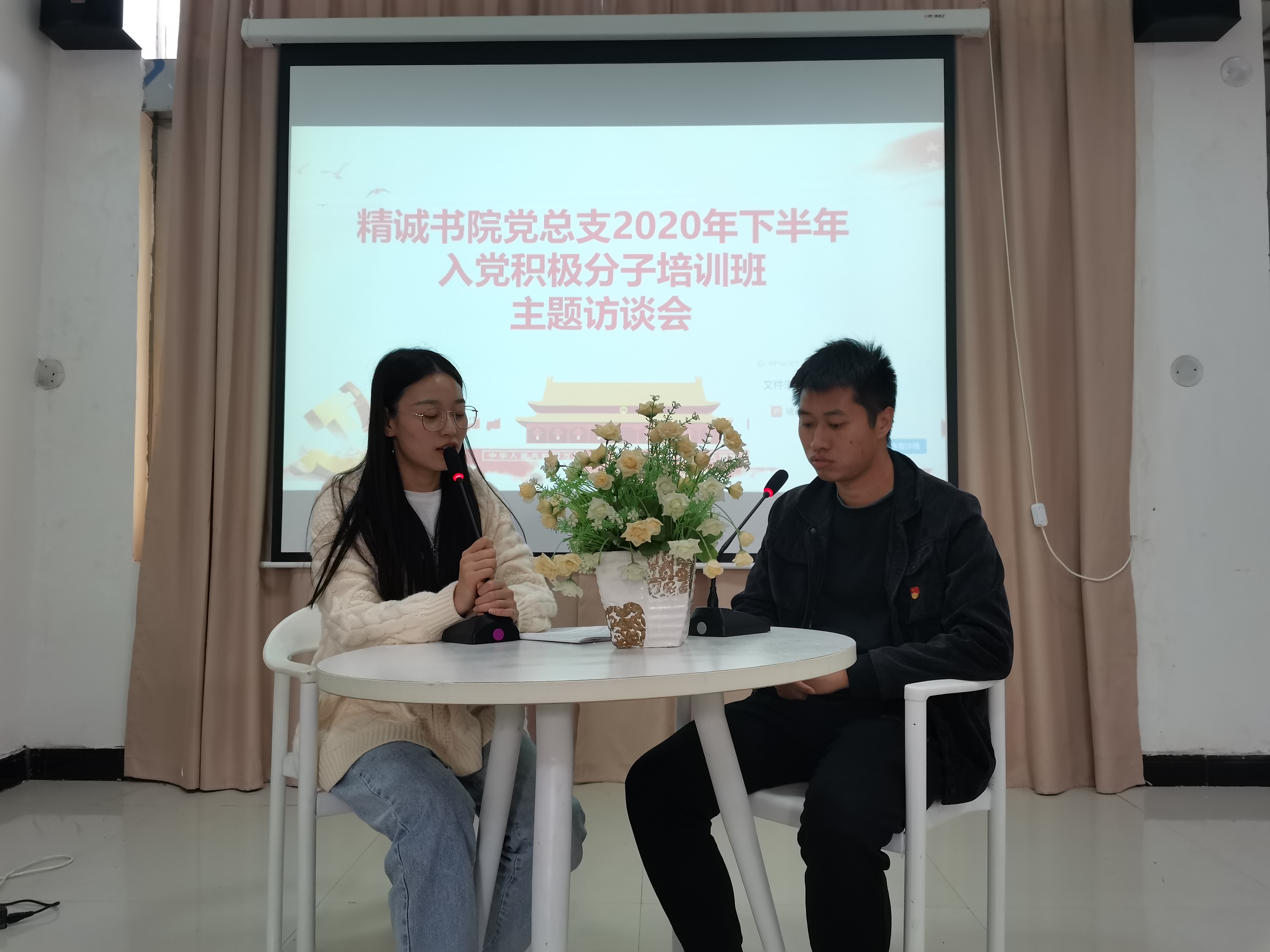 10月18日下午,精诚书院党总支党务专干李高杰老师,在党员活动室组织开展了主题为“访谈身边的共产党员”的访谈会。访谈会邀请了三位访谈嘉宾,分别是优秀教师党员代表蒋万里老师,优秀学生党员代表王会丹同志以及优秀积极分子代表许瑞琳同学,访谈采用“一对一”的方式进行,三位访谈嘉宾围绕谈谈你从抗击新冠肺炎疫情期间的共产党员身上学习到了什么?你在抗击新冠肺炎疫情期间是如何做的?谈谈你最初的入党初心和入党动机是什么?你从入党积极分子到成为一名共产党员期间,是如何严格要求自己的?等问题进行分享。最后,由李高杰老师代表精诚书院党总支进行了总结发言,对培训班全体学员提出了具体的要求和期望。